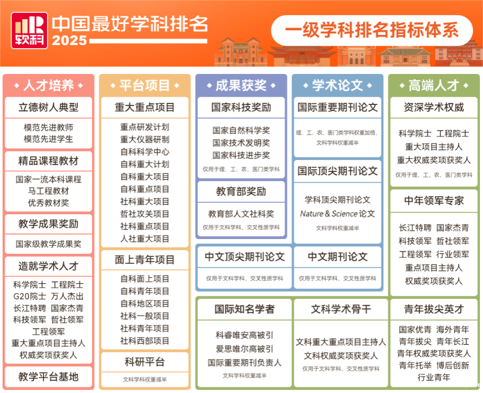 软科中国最好学科排名(一级学科)的指标体系包括人才培养、平台项目、成果获奖、学术论文、高端人才5个指标类别,下设19个指标,共计200多项反映学科竞争力的观测变量。软科中国最好学科排名(专业学位类别)的指标体系包括人才培养、师资队伍、研究创作、学术论文和社会声誉5个指标类别,下设18个指标,共计100多项观测变量。由于部分指标在不同学科门类的适用性和重要性存在差别,因此中国最好学科排名在不同学科采用差异化的指标体系。中国最好学科排名的指标体系如下图所示。