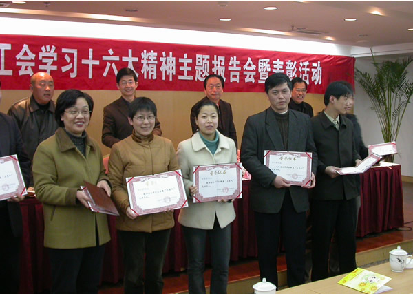 3月15日,校工会在杭州三台山庄举行了“学习十六大精神主题报告会暨表彰活动”。副院长张硕年、侯宇,纪委书记陈宏硕出席了会议。侯宇副院长代表党委讲话。会议由工会常务副主席朱金奎主持。