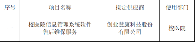校医院信息管理系统软件的开发单位是创业慧康科技股份有限公司。由该公司负责后续维保服务,项目采用单一来源方式。