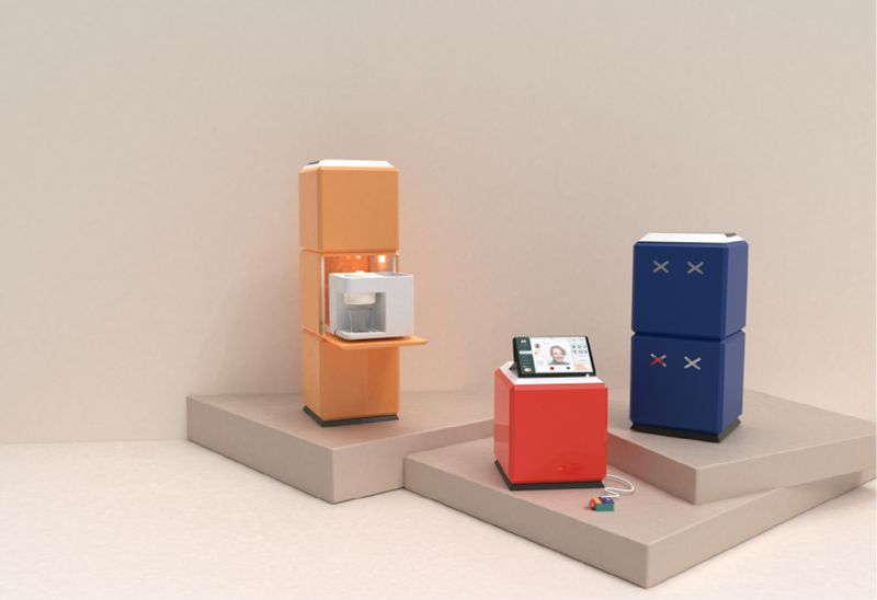该小组因为从新中式烹饪、新形态、颠覆性和集成式四个方向中选择了集成式作为自己的研究方向。所以他们设计了新颖的电源连接方式和控制中心模块;供电部分设计在每个cube的上表面和下表面,堆在一起就能供电。控制中心模块创新性的将电器的操作界面集成到一个cube上,通过在液晶显示器上操作即可控制所有电器。巧妙解决了厨房电器插座过多,操作问题繁琐的现象。使得产品往极致的标准化又更近了一步。值得一提的是,该小组作品选用的产品配色让评委、外教和老师们都眼前一亮。大胆又中国风的配色让他们的作品在众多黑白灰的厨电产品中显得那么“crazy”,可25年的年轻一代难道不可以是个性的一代吗?打破工业风的亮丽产品配色也给评委们留下了深刻的印象,为他们的产品加分不少。