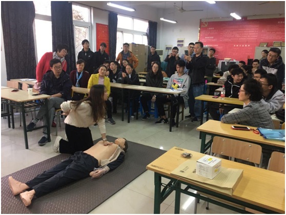 校医首先运用多媒体课件给大家讲解了触电的危害,以及触电之后的应急措施。校医幽默风趣叙述了成人心肺复苏模拟人CPR急救简易三步骤:如何判断伤员是否心跳呼吸停止、是否需要心肺复苏的指征、操作步骤以及救助过程中的注意事项等进行了详细的演示,并着重强调了心肺复苏要遵循的CAB流程。C-compression即胸部按压,A-airway即开放气道,B-breathing即人工呼吸。