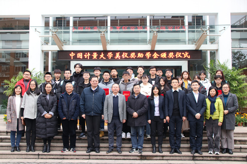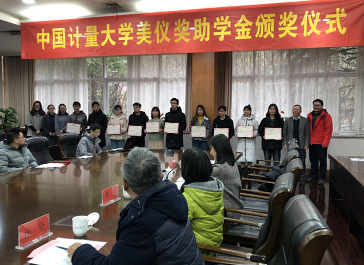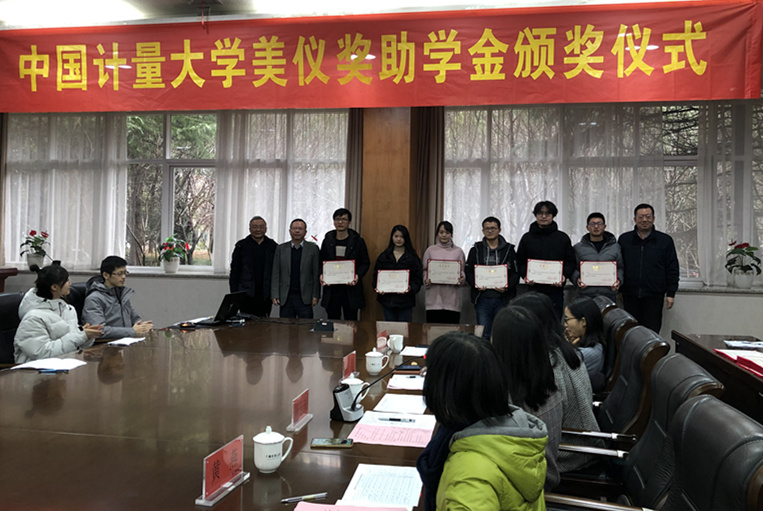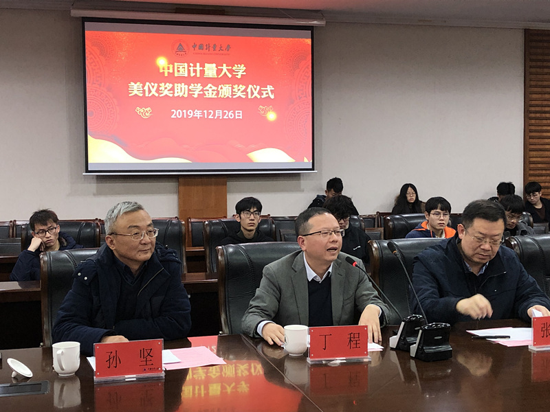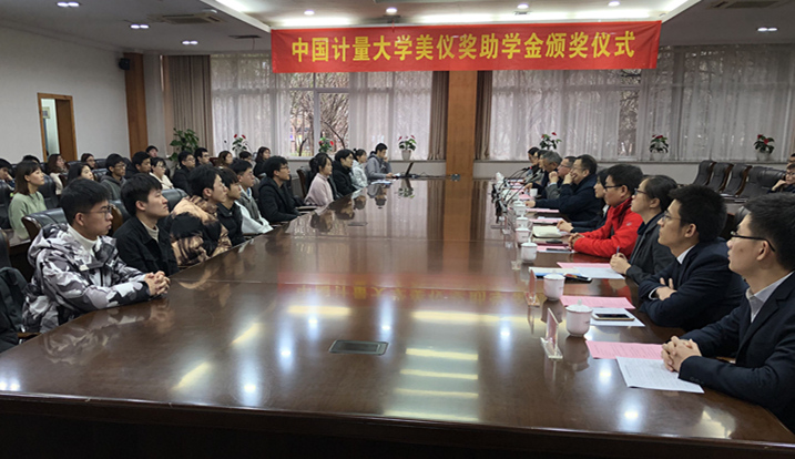 2019年12月26日上午10:00,我校在闻厅一楼会议室隆重举行了2019年美仪奖助学金颁奖仪式。杭州美仪自动化技术股份有限公司董事长丁程、人力资源部经理王婉、运营部经理陆天磊(机电学院校友)、研发部徐冬(计测学院校友),研究生院院长张勇,学生处副处长黄燕,机电工程学院院长孙坚、党委书记朱兆武,计测学院党委副书记邹志刚,质安学院党委副书记李波,光电学院党委副书记李佳,信息学院党委副书记蔡玲丽出席颁奖仪式,22名获奖学生及各相关学院辅导员、学生代表共计50余人参加了颁奖仪式。颁奖仪式由机电学院党委副书记杨玉书主持。