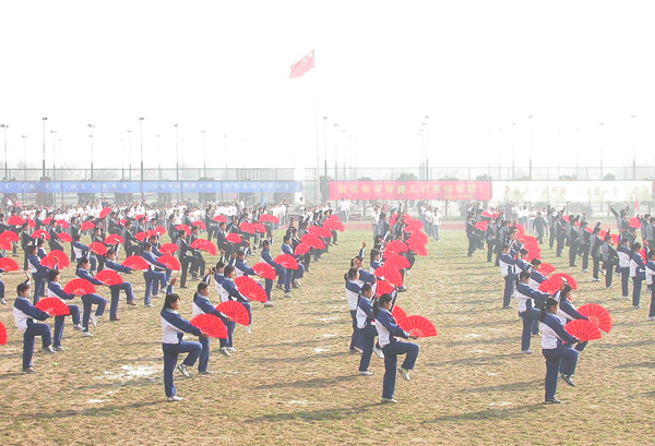 随后,跆拳道、乒乓球、网球、羽毛球、功夫扇、健美操等形式多样的大型团体操表演拉开阵容,展现了量院师生朝气蓬勃、奋发向上的精神面貌。