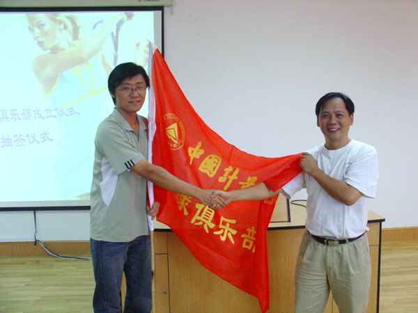 随后,季建成给俱乐部理事会主席孔祥鹏同学授俱乐部部旗,孔祥鹏同学就网球俱乐部发展规划发表了就职演说。