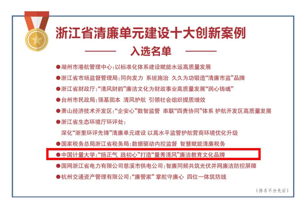 11月14日,2025年度清廉建设(浙江)创新案例发布会在杭州举行,兼具时代性、创新性、实操性的高质量清廉建设成果纷纷亮相。我校“量秀清风”廉洁教育文化品牌成功获评“浙江省清廉单元建设十大创新案例”,是全省高校唯一获评的项目。