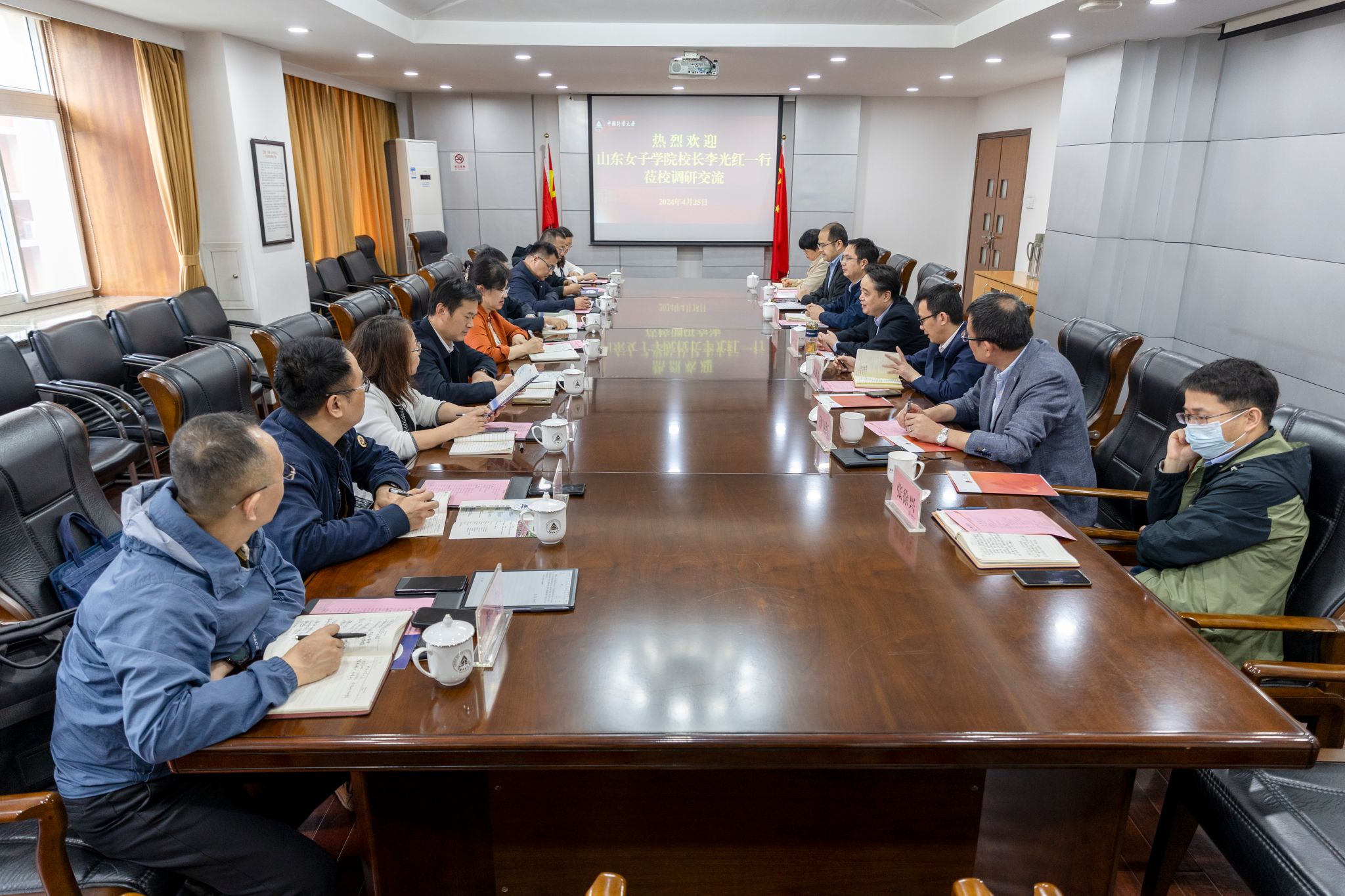 4月25日,山东女子学院校长李光红一行来校调研交流。校长徐江荣出席并主持座谈交流会。办公室、发规处、教务处、科研院、人事处、法学院等相关单位负责人参加座谈。
