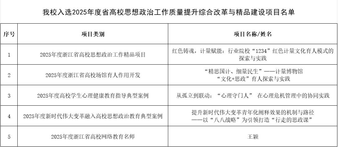 近日,2025年度浙江省高校思想政治工作质量提升综合改革与精品建设项目入选名单公布,我校喜获佳绩,共有5个项目入选,涵盖高校思想政治工作精品项目、高校场馆育人作用开发、高校学生心理健康教育指导典型案例、新时代伟大变革融入高校思想政治教育典型案例和高校网络教育名师等类别,入选数量为历年最多。