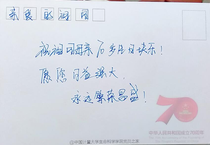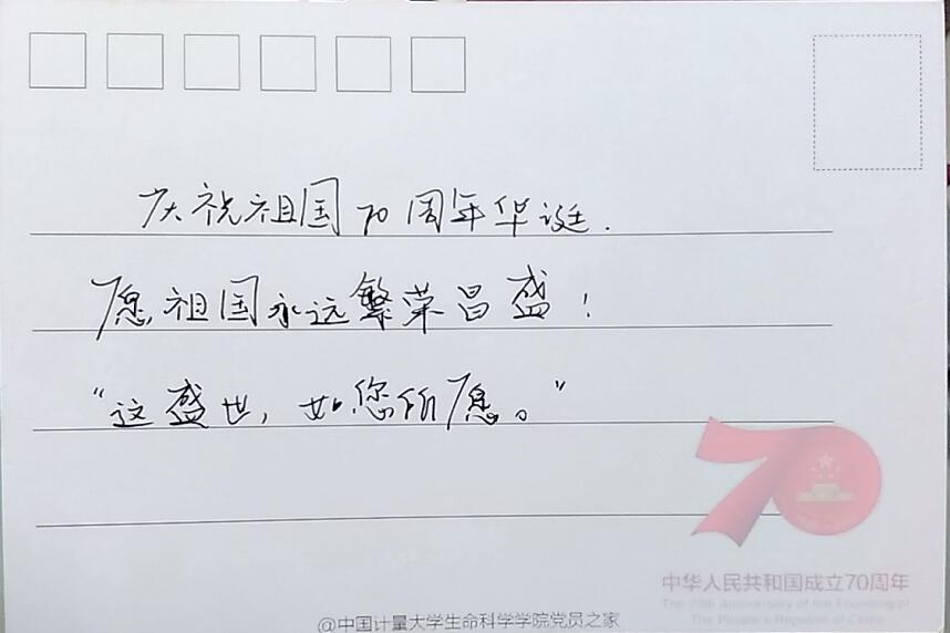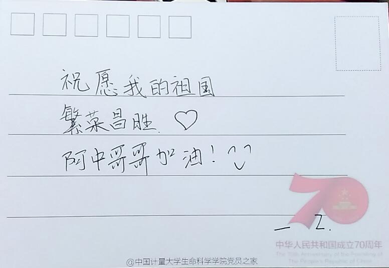 “我对祖国母亲有话说”活动中,同学们在70周年定制版明信片上写下了对祖国母亲最深情的祝福:“愿祖国繁荣昌盛”、“这盛世,如您所愿”、“阿中哥加油”。“70年岁月长河知多少”活动也吸引了众多同学参与,一道道党史知识小问答向同学们展示祖国70年的风风雨雨,带领同学们感受祖国如今的辉煌壮丽。参与并答对题目的同学获得定制的70周年量量钥匙扣和小国旗。