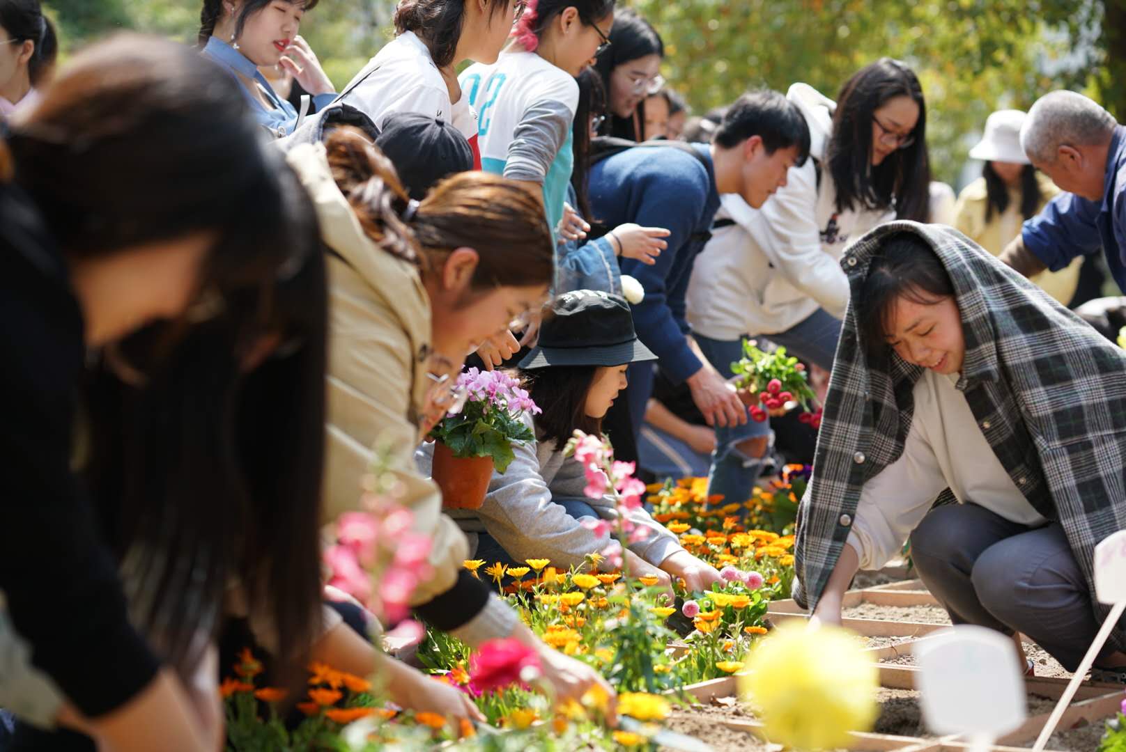 活动当天,尽管烈日当空、天气炎热,但是在场的同学们兴致勃勃。在公寓生活指导老师的组织下,同学们以寝室为单位,一个寝室一个种植框,在绿化园丁的指导下,同学们一会儿挖坑、一会儿填土、一会儿浇水,说着、笑着、勤快着,完全不顾脸上的灰和鞋上的土,虽然个个累得满头大汗,但又个个神采飞扬,脸上洋溢着幸福和欢快的笑容。