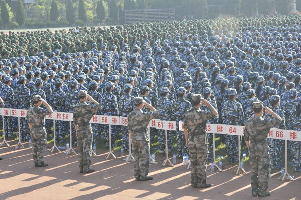 8月23日上午,身着海、陆、空三军迷彩服的5000多名2009级学生在学校北田径场内站成整齐的三大方阵,参加在这里举行的2010年学生军训动员大会。校党委书记于永明,党委副书记徐涌金、陶伟华,副校长冯时林、宋明顺,党委委员、学生处处长范庆瑜和空军28师副政委马学蒂,副参谋长祝马琰等部队领导出席了动员大会。大会由党校办主任杨政主持。