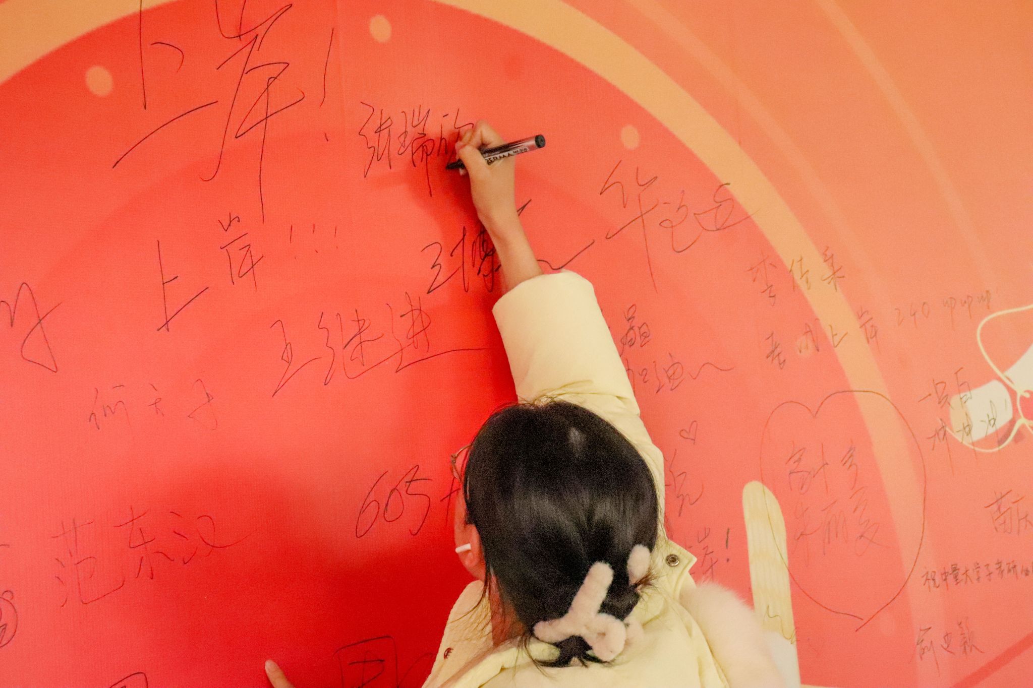 “没想到能在这里和‘量量’来个熊抱。我感觉特别有能量,很暖心。”来自19药学1班的张瑞欣与“量量”拥抱并开心地合影。一个拥抱,传递的是无言的安慰,是热烈的鼓励,也是妥帖的陪伴。“备考的过程中难免会有压力,但是慢慢地我发现结果并不是最重要的,能从头坚持到尾的我已经很厉害了。”这个乐观的女孩提笔在签名墙上写下“上岸!”,简短的两个字也说出了无数考研人最大的期待。