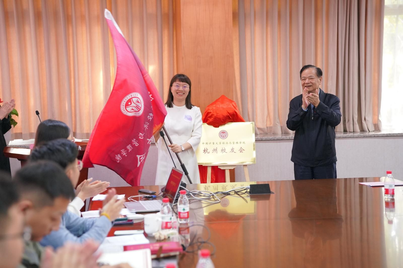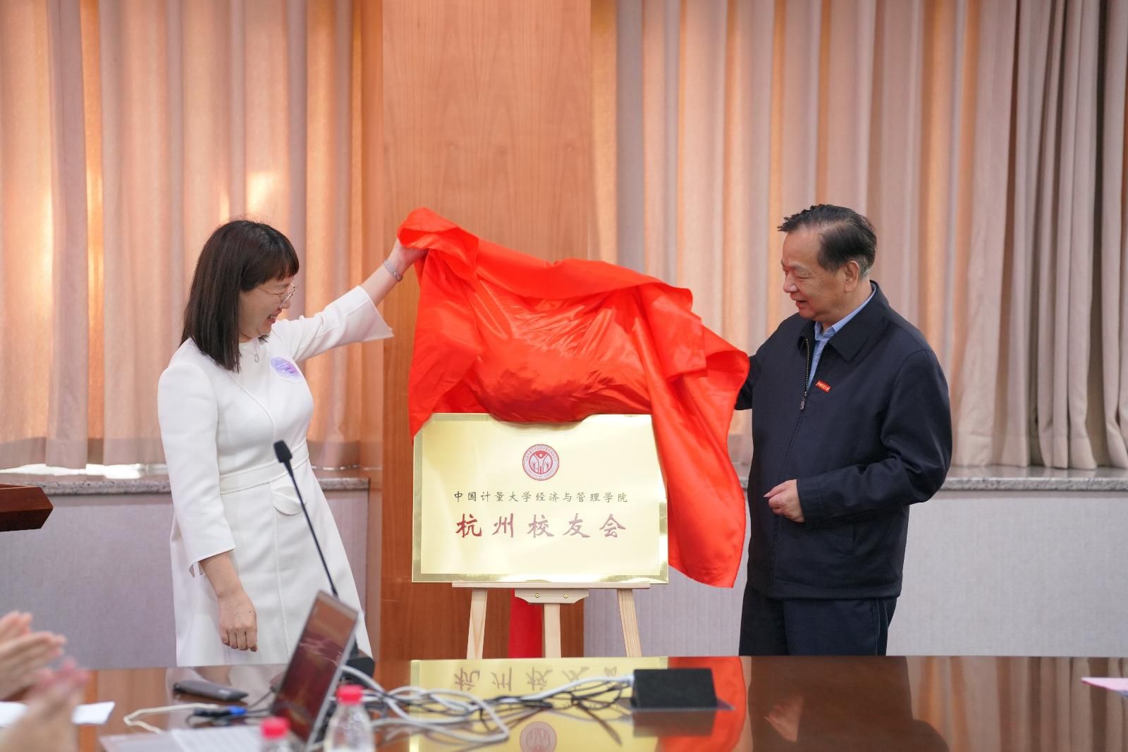 冯时林为经管学院杭州校友会揭牌,并向会长徐海钗授予校友会会旗。