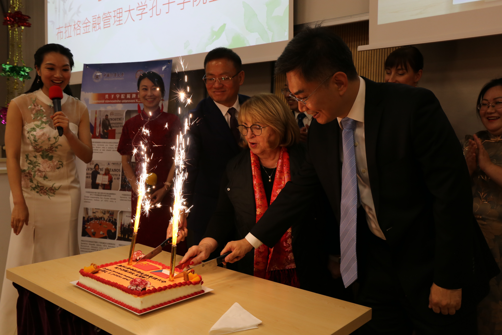 11月14日,我校共建的布拉格金融管理大学孔子学院在捷克首都布拉格隆重举办建院五周年庆典活动,中国驻捷克大使冯飚、使馆教育事务负责人蒋宇鹏、捷中友好协会副主席Petr Mrhálek、布拉格金融管理大学校长兼董事会主席Bohuslava Šenkýřová、董事会副主席Emil Šenkýř、副校长Petr Budinský、我校副校长王斌锐等领导出席庆典现场。中国国际中文教育基金会副理事长、秘书长赵灵山发来贺信,布拉格金融管理大学师生代表、孔子学院师生代表、捷克华人华侨代表、中资企业代表、新闻媒体及社会各界人士200多人参加庆典活动。