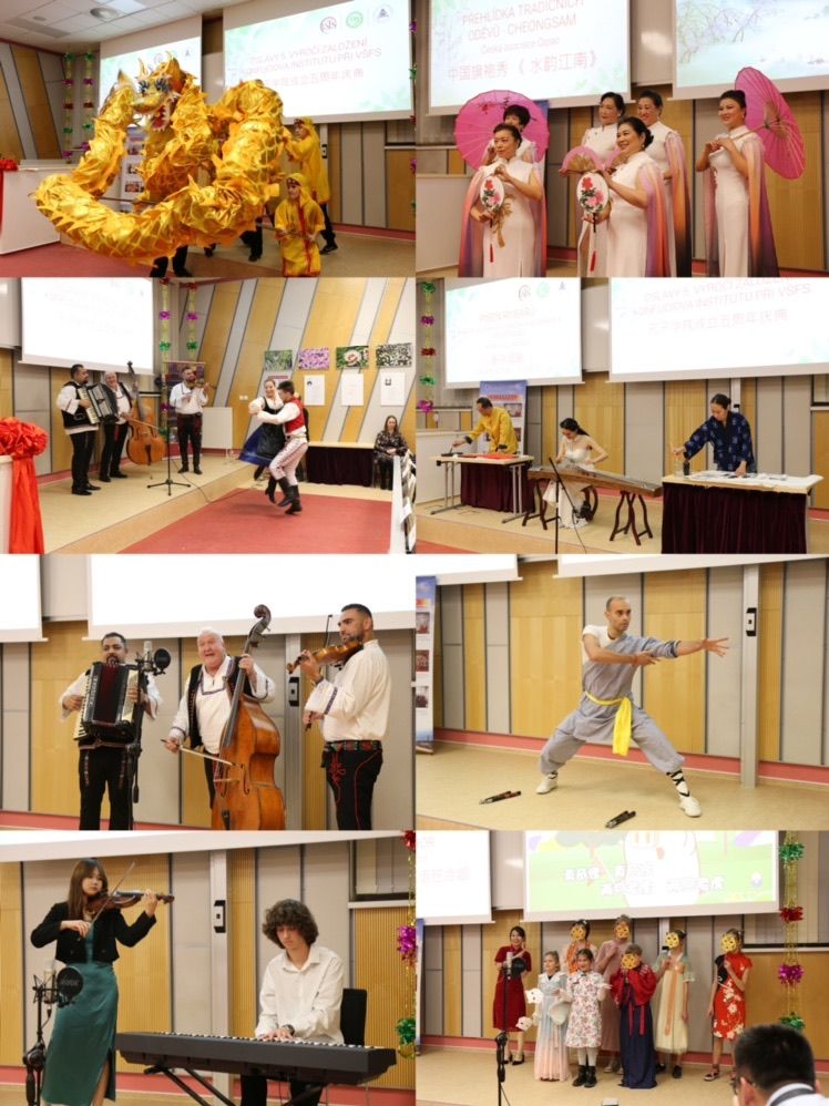 庆典活动现场还组织了精彩的文艺演出,包括捷克武术协会的舞龙和武术表演、旗袍协会的传统服装秀、捷克中医药文化中心的易筋经展演、书法协会的国画书法展示及古筝演奏、捷克民间艺术团的摩拉维亚和斯洛伐克歌舞表演、中捷少年儿童的歌曲及乐器合奏表演等。庆典活动现场氛围热闹而喜庆,与会嘉宾及社会各界友人纷纷祝愿并期盼布拉格金融管理大学孔子学院越办越好!