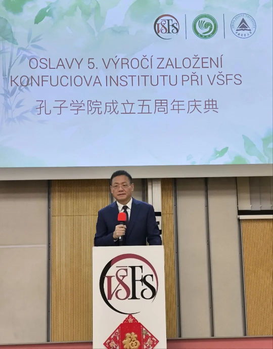 我校副校长王斌锐在致辞中指出,两国领导的关怀为孔子学院的发展奠定了坚实的基础,两校的精诚合作、相互信任与支持为孔子学院的发展提供了强劲的动力,在中国驻捷克大使馆领导及布拉格金融管理大学领导的关怀和支持下,在捷克社会各界友人及广大华人华侨的支持下,在全体孔院师生的共同努力下,孔子学院的办学规模稳步扩大、学员人数大幅增长、文化活动丰富多样、社会知名度不断提升,孔子学院作为连接两校友谊与合作的桥梁与纽带作用越来越突出。他代表学校向大使馆领导、布拉格金融管理大学领导及师生、社会各界朋友表示衷心感谢,并表示学校将继续支持和推动孔子学院的高质量发展,为打造“标准化+金融”特色孔院而不断努力!