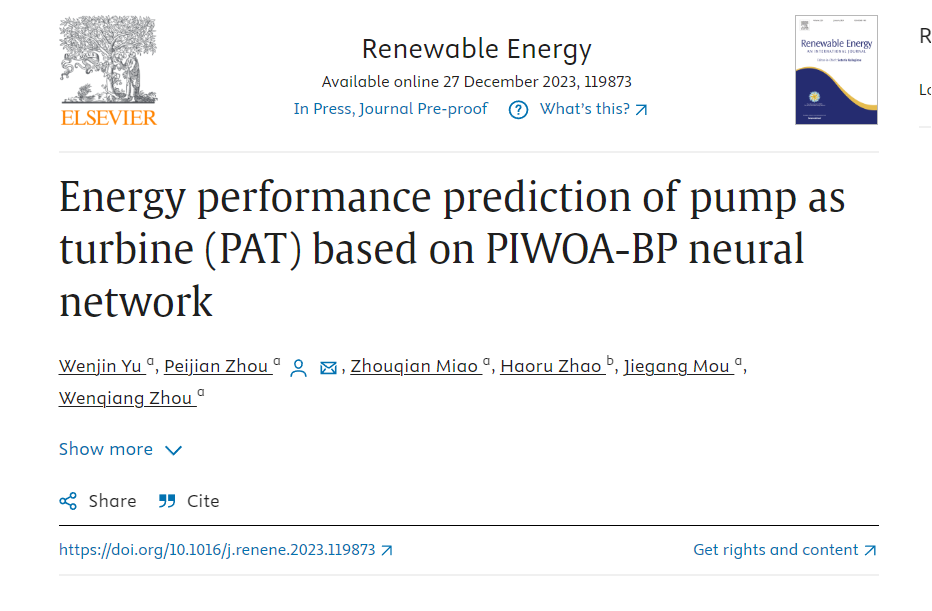 近日,伟德体育中国计量测试工程学院周佩剑副教授题为“Energy performance prediction of pump as turbine (PAT) based on PIWOA-BP neural network”(基于PIWOA-BPNN模型的泵作透平性能预测方法)的研究论文在能源领域权威期刊Renewable Energy (IF 8.7,中科院1区)在线发表。通讯作者为周佩剑副教授,第一作者为本校研究生余文进。