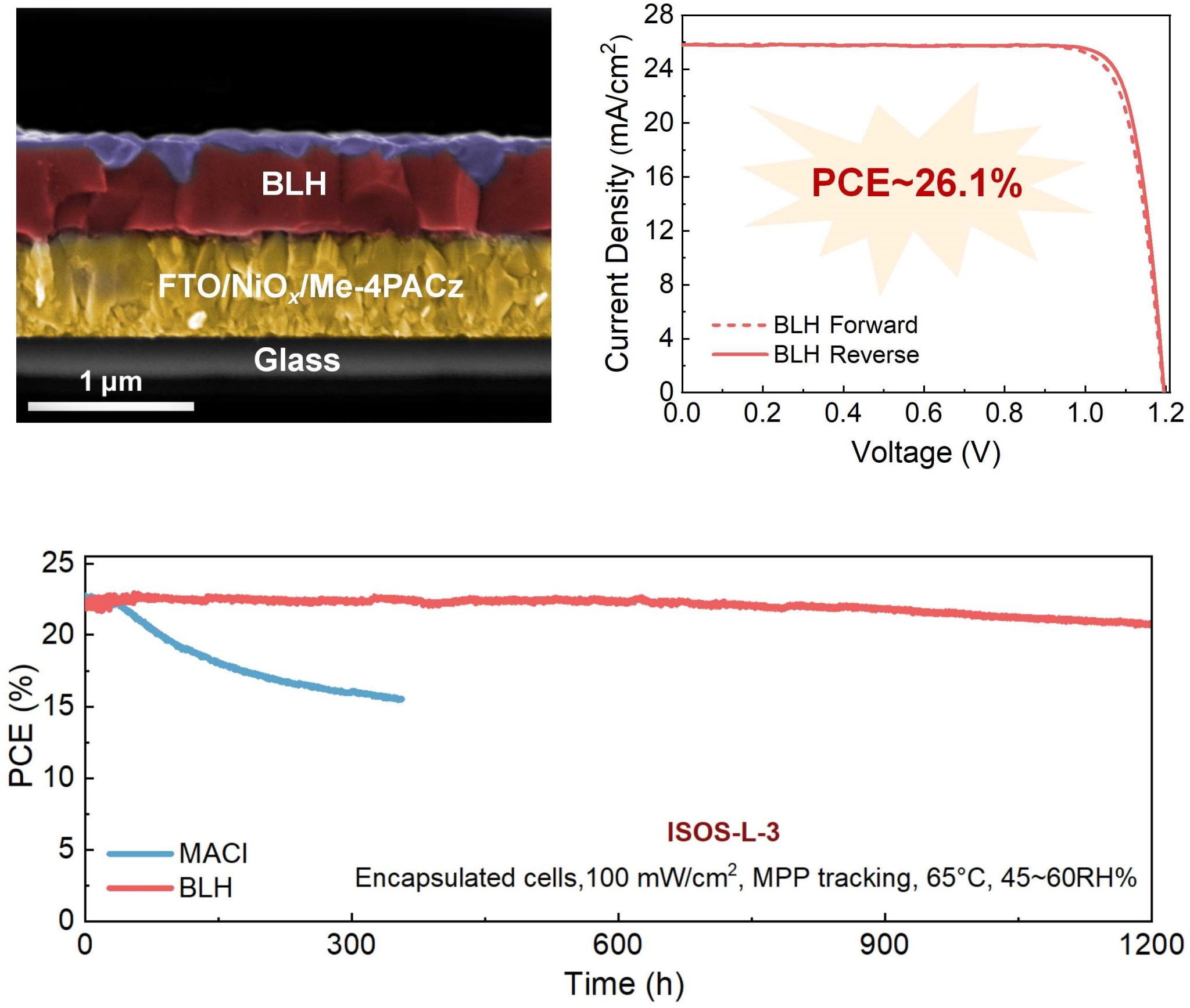 钙钛矿太阳能电池的效率与SQ理论极限仍存在较大的差距,主要由于钙钛矿上表面高缺陷态密度造成的开压损耗所致。鉴于此,近日我校理学院青年教师朱雪良于Advanced Materials刊发了一种巧妙的表面“溶解-再结晶”策略,并构建出独特的双层异质结(BLH)。该项研究确立BLH作为一种变革性的方法,可以将钙钛矿/C60界面处缺陷态密度降低至前所未有的水平。与传统2D异质结膜厚(5-20 nm)不同,BLH膜厚可达50-70 nm且不影响载流子的层间传输。更重要地是,在1.52 eV带隙的BLH结构器件中,Voc损失降低至325mV,达到了SQ理论极限的97%以上,可媲美GaAs太阳能电池。相应器件的光电转化效率也突破至26.1%(认证25.72%),为最高效率的单节钙钛矿太阳能电池之一,在最大功率点持续测试1200小时后仍可保持初始效率94%以上。该项研究对于倒置钙钛矿光伏领域发展具有极其重要的意义,攻克了长期以来限制钙钛矿太阳能电池高效率的瓶颈。