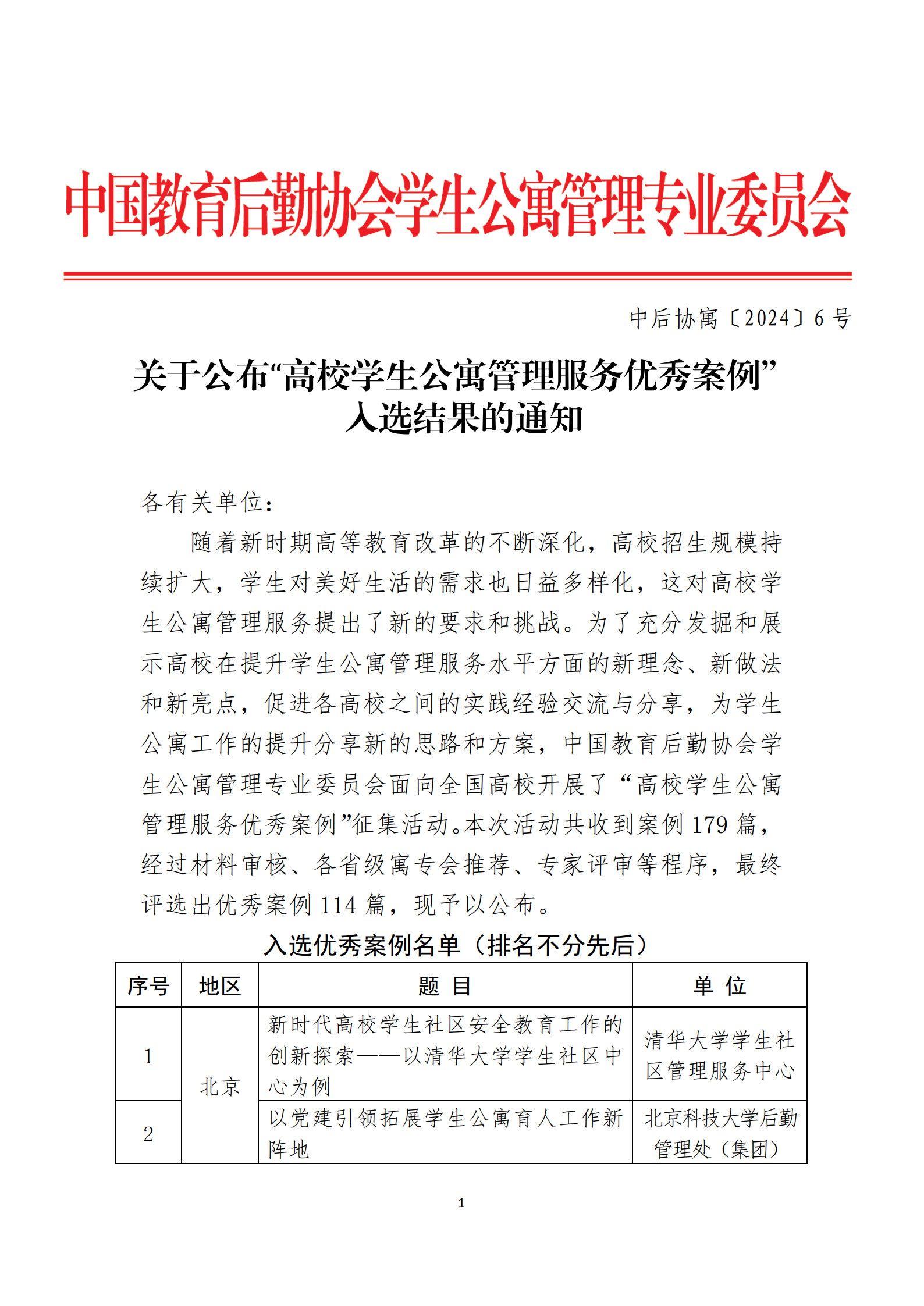 2024年11月1日,在中国教育后勤协会学生公寓管理专业委员会二届三次委员会议上宣布了全国“高校学生公寓管理服务优秀案例”入选结果。我校后勤服务中心“深化管理体制改革创新,探索公寓管理工作新路径——以伟德体育中国学生公寓管理服务工作为例”的案例报告成功入选,成为全国114个优秀案例之一。