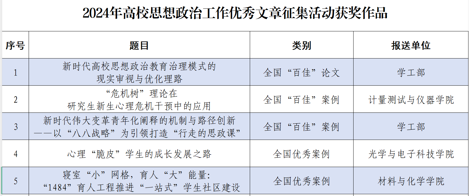 其中,学工部报送的学术论文《新时代高校思想政治教育治理模式的现实审视与优化理路》获评全国“百佳”论文;计量测试与仪器学院、学工部报送的思政工作案例《“危机树”理论在研究生新生心理危机干预中的应用》《新时代伟大变革青年化阐释的机制与路径创新——以“八八战略”为引领打造“行走的思政课”》获评全国“百佳”案例;光学与电子科技学院、材料与化学学院报送的思政工作案例《心理“脆皮”学生的成长发展之路》《寝室“小”网格,育人“大”能量:“1484”育人工程推进“一站式”学生社区建设》获评全国优秀案例。